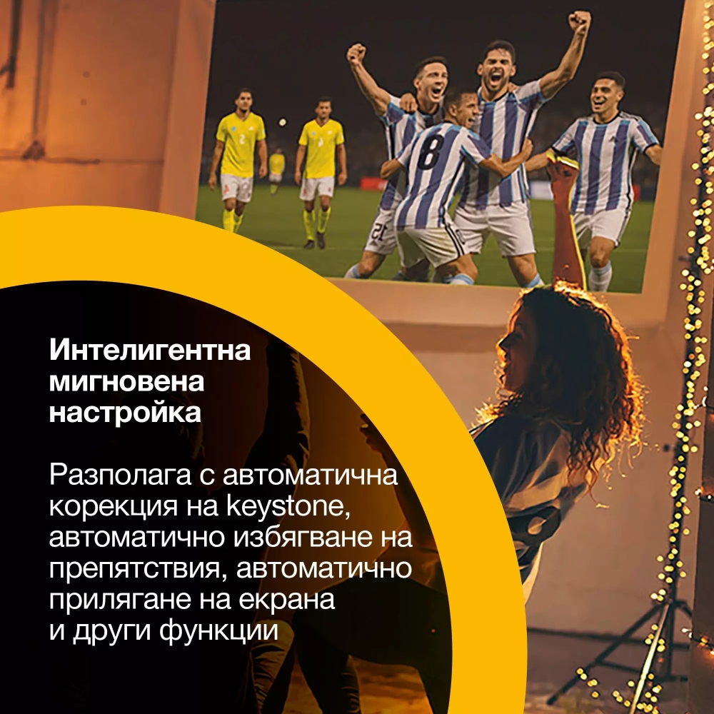 Преносим smart проектор, Sound by Bose, Google TV, 4K Pro UHD, 1000 лумена, 3LCD x RGB-LED, регулируема стойка, настройка без усилие, употреба на закрито и на открито. Насладете се на наистина завладяващи моменти с преносимите smart проектори Epson Lifestudio. Елегантни, компактни и заредени с функции, те са проектирани с усъвършенствана, най-съвременна технология за изображения и аудио, вградени функции за smart TV и лесна настройка за безпроблемно завладяващо забавление на закрито и навън. Насладете се на богато и кристално чисто аудио, задвижвано от найсъвременната технология Sound by Bose, с интегриран Bluetooth и Dolby Audio за наистина потапящо изживяване. Озарете живота си с визуализации със 1 000 лумена 4K Pro UHD, задвижвани от 3LCD x RGB-LED от Epson, които осигуряват живи, реалистични изображения. С поддръжка на HDR10и динамичен коефициент на контрастност от 5 000 000:1 за ясни сенки, фини детайли и дълбоки черни тонове.